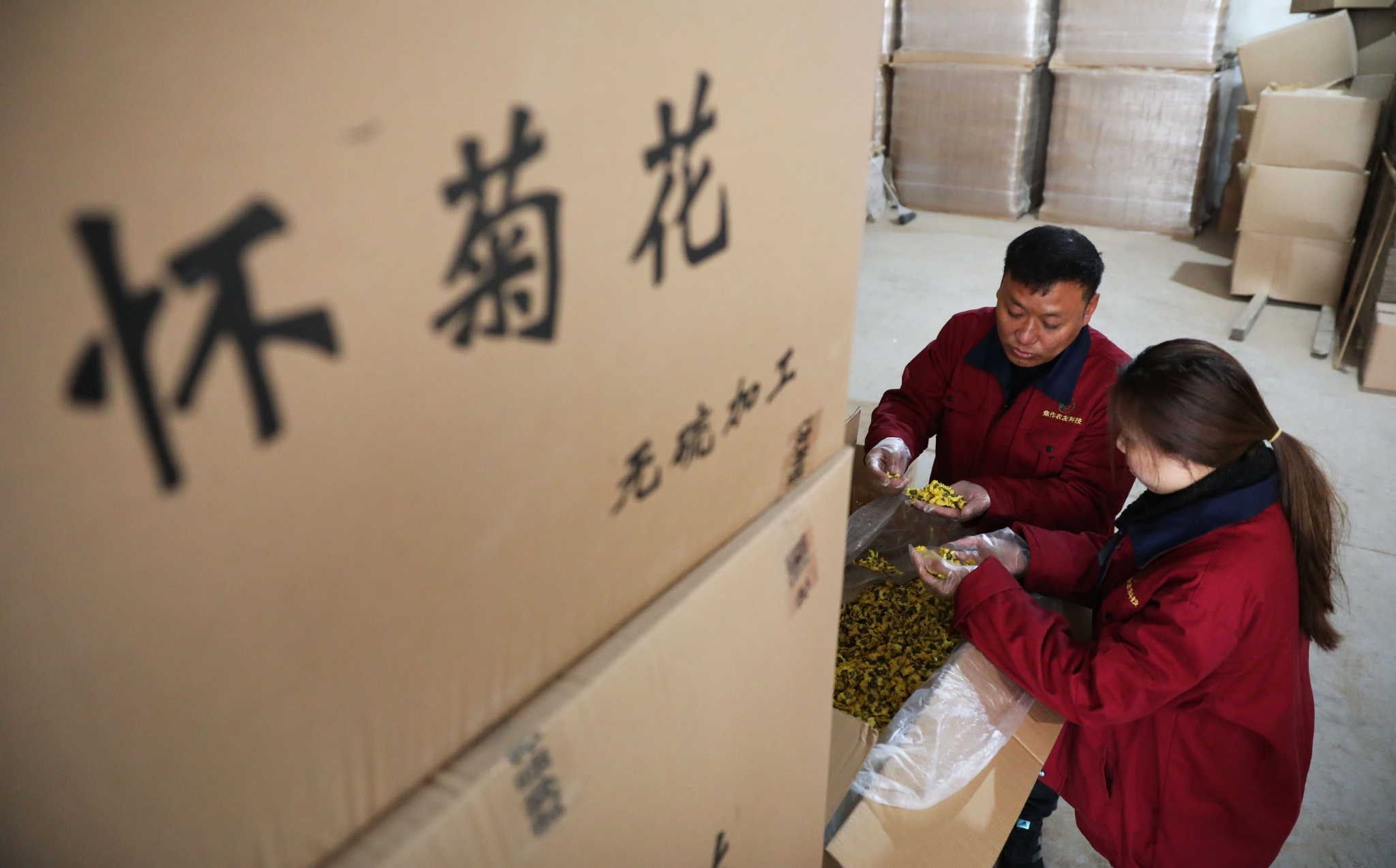 3月16日,在河南省武陟县农友种植专业合作社,工人在抽检怀菊花质量。新华社发(冯小敏 摄)