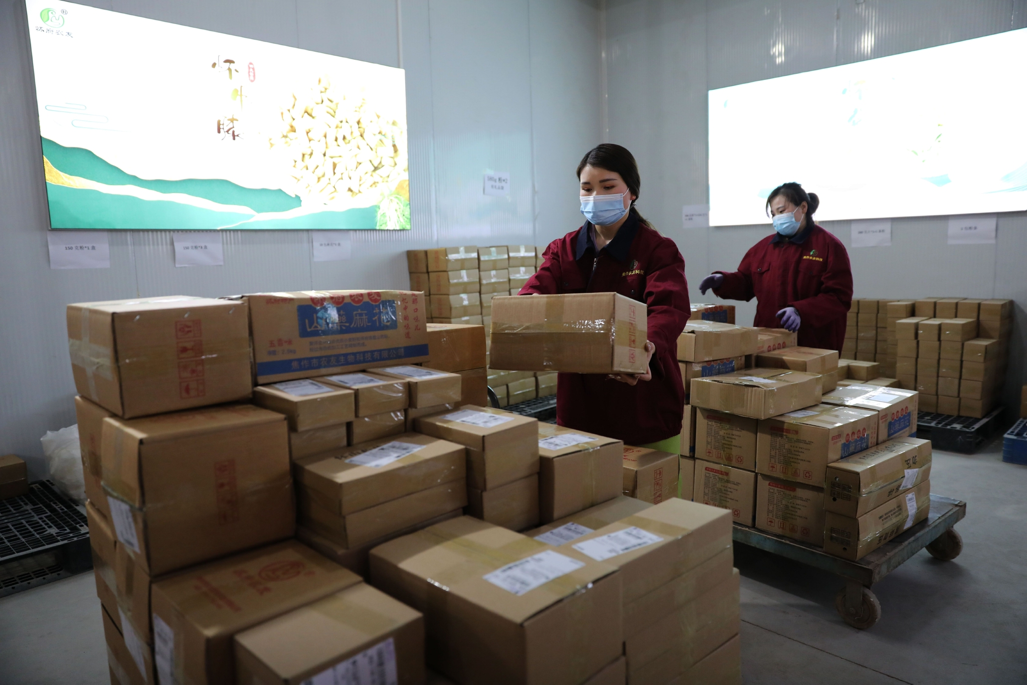 3月16日,在河南省武陟县农友种植专业合作社,工人打包好准备快递的山药产品。新华社发(冯小敏 摄)
