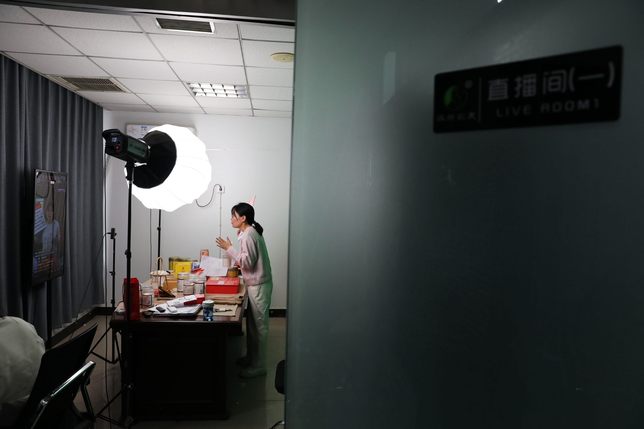 3月16日,在河南省武陟县一家怀药生产企业,员工通过电商直播销售怀药产品。新华社发(冯小敏 摄)