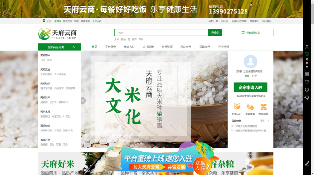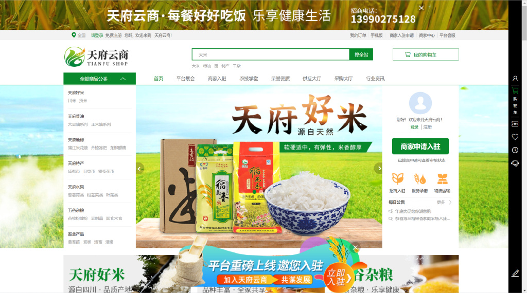 互联网时代对于所有传统企业来说都是一个大时代,天府云商借助互联网发展的趋势,整合分散在各地区的各类特产资源为全国互联网用户提供一站式特产信息服务!天府云商汇合了天府好米、天府菜油、天府地标、天府特产等相关行业上下游资源,平台以贴心的服务、便捷的浏览方式、完善的功能资讯吸引客户在网上交易,在信息发布与推广上,尽可能满足用户、代理商与经销商、生产厂家等在网上进行产品的信息发布、选购与推广的需求。