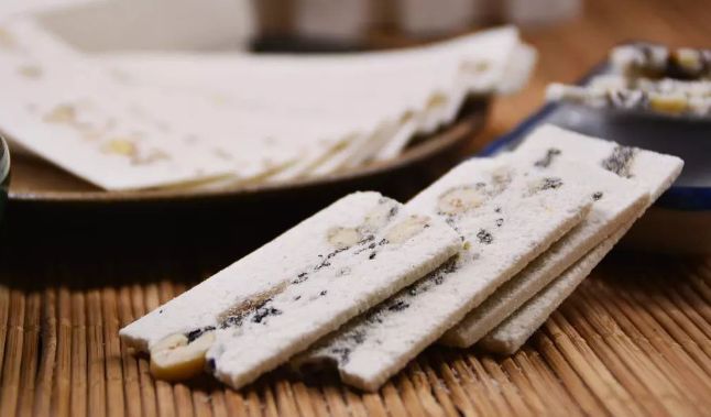 合川桃片始创于1840年。用上等糯米、核桃仁、川白糖、蜜玫瑰等原料,精制加工而成,是重庆市地方名产之一。特点为粉质细润,绵软,片薄,色洁白,味香甜,突出浓郁的桃仁,玫瑰香味。