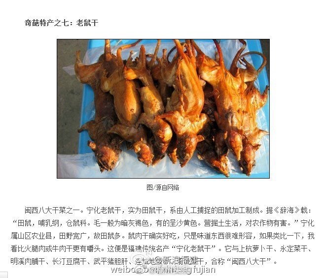 #福建人爱带出远门的的特产# 【细数福建那些让人闻风丧胆的奇葩特产】 节后返程,妈妈给装的行李箱后备箱塞满了满满的特产,让我们来细数福建让人闻风丧胆的特产!早前,福州陈小姐吃老鼠进补的新闻,让许多小伙伴不淡定了。 其实,乃们不知道,福建一些“奇怪”的土特产被疯狂吐槽,以老鼠干、血蚶、笋丝、鸡仔胎为首。下面一起来看那些年,我们为之惊叹的特产到底长啥样!福建的小伙伴,哪些特产你难以抗拒呢