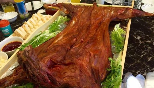 土耳其烤全羊,是土耳其人招待贵宾的特色菜。把一只肥嫩的羊羔去掉头脚和羊皮,掏空内脏,然后在空肚于里塞满,伴着葡萄干、杏仁、松子等佐料,是土耳其特色美食小吃。