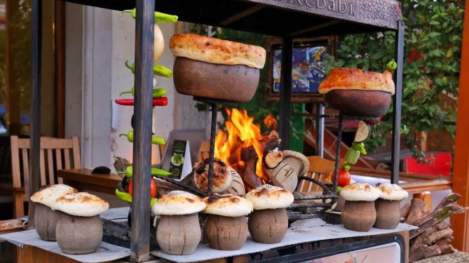 土耳其瓦罐炖肉,是土耳其的特色菜。将羊肉、牛肉等肉类和番茄等蔬菜放在瓦罐里,罐口用面团密封,放入明火烤炉里慢慢炖上个把钟头。上菜时用一把榔头将罐子很有技巧地敲破,让你享受罐中美味。尤其是瓦罐羊肉非常入味,在当地颇受欢迎,在很多土耳其风味餐厅都能吃到。