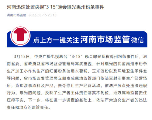3月15日晚,央视3·15晚会曝光了禹州市夏都三粉厂、禹州市瑞田农副产品有限公司、禹州市锋范农副产品有限公司、禹州市豫康三粉加工厂、禹州市禹鑫粉业有限公司5家企业使用廉价木薯淀粉替代红薯淀粉制作禹州特产红薯粉条。