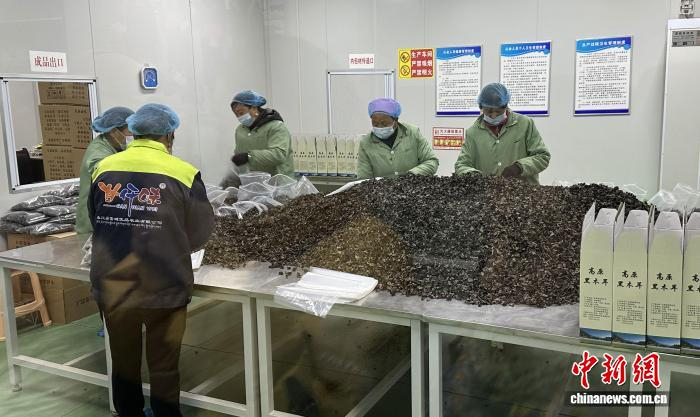 1月31日,在卓尼县“雪域优品”生产车间里,工作人员正忙着分拣黑木耳。中新社记者 冯志军 摄目前,“中国黑木耳之乡”卓尼已形成集菌种研究、菌棒加工、育菌培养、吊袋种植、包装销售一体化的规模,产业链条趋于完善,并衍生出即食木耳、木耳肽液、木耳罐头等系列产品。