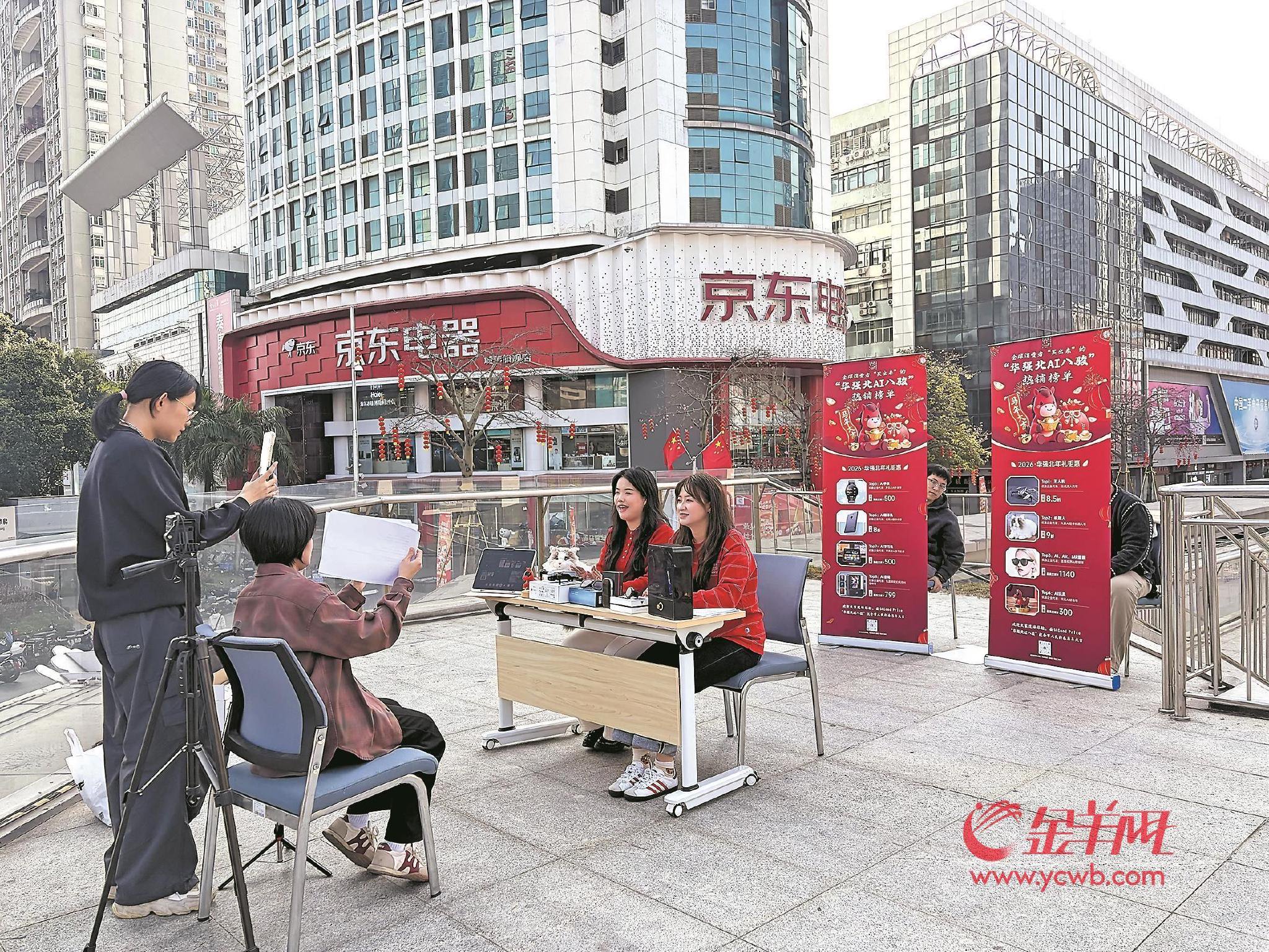 2月13日11时,直播正式开始。在华强北最显眼的地方——华强北主街观景台,来往客流络绎不绝,一台手机、一张桌子、两个易拉宝组成的简易直播间,虽简朴但格外引人注目。