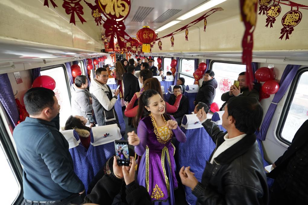 各族群众在列车“巴扎”上载歌载舞。新华社记者白志强摄