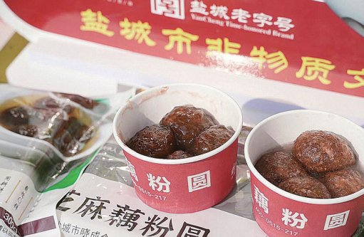 “来来来,请您试吃。”一碗碗现煮的藕粉圆,蒸腾起白烟袅袅,在寒风中让人倍感温暖。记者接过摊主分发的小碗,一勺舀起一个沉甸甸的藕粉圆,轻咬晶莹剔透的外皮,入口香甜软糯、爽滑有劲。“藕粉圆是盐城人过年必吃的美食,有200多年历史,传统技艺主要采用五仁连同桂花、白糖、猪油擦匀,揉搓成团,入锅烫制再滚入藕粉,反复6次才能最终完成。”江苏省非物质文化遗产代表性传承人成韦热情地介绍,藕粉圆制作技艺传承到他已经是第六代了。他还开办了专门规模化制作藕粉圆的公司,“晓成”是该企业代表性注册商标。去年,晓成藕粉圆非遗工坊(江苏省省级非遗工坊)成立,面积3000多平方米,持续推动传统工艺创新发展。