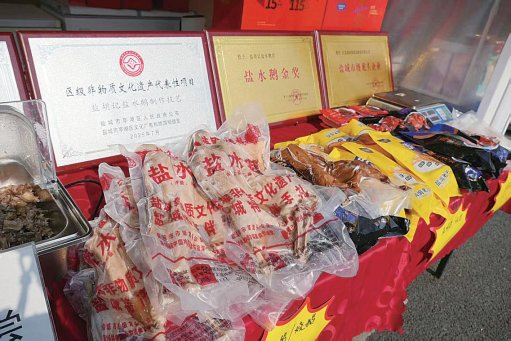 “盐城因盐而兴。来盐城,当然要先尝尝盐卤美食!”在当地消费者建议下,记者首先来到盐城名吃盐水鹅的摊位前。盐城市亭湖区非物质文化遗产代表性项目——盐胡记盐水鹅制作技艺传承人胡龙,正在摊位忙碌。他向记者讲述,历史上,亭湖区草木丰茂,加上盐卤资源,盐水鹅这样的地域美食应运而生。如今,除了坚守“三腌三晾”的传统技艺,胡龙还开办了相关生产公司,并申请注册了系列“盐胡记”商标。“在坚持非遗+商标品牌’发展模式的同时,我们还将老手艺进行革新,鹅肉咸香不腥、紧实入味的秘密之一就是盐度标准化控制在2.8’这个数值。”胡龙介绍,标准化生产为非遗品牌积极拥抱互联网打下了基础,目前该品牌线上线下年销售盐水鹅近50万只。