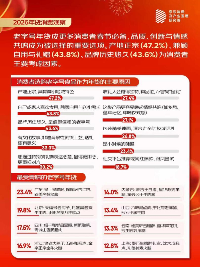 在年货流动的图谱中,老字号品牌正经历一场静默而深刻的复兴。它们不再仅仅是怀旧符号,而是凭借品质、创新与情感共鸣,重新成为年节送礼的重要选项。调研显示,广东的皇上皇腊肠、陶陶居杏仁饼、致美斋柱侯酱等老字号成为今年春节最受消费者青睐的老字号年货。紧随其后的是天福号酱肘子、月盛斋酱烧牛羊肉、正明斋京八件糕点等京城老字号年货,此外四川的绍丰和郫县豆瓣、新繁泡菜、青城山香肠腊肉,浙江的诸老大粽子、五味和糕点、金字正宗金华火腿等老字号也是今年春节年货消费的热门选项。