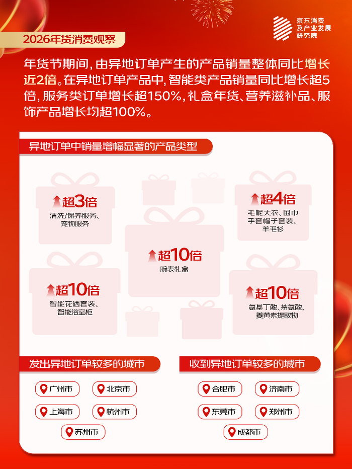 年货的跨地域流动加速,隔空参与年货置办为节日热度加温。消费趋势显示,腊八至今,京东上异地订单所产生的商品销量整体同比增长近2倍,其中以浙江、重庆、西藏、新疆、云南、青海等地作为异地订单收货地的商品销量增长均超3倍。从全国各城市维度来看,异地订单发出量较大的城市包括:广东广州市、北京市、上海市、浙江杭州市、江苏苏州市;而异地订单接收量较多的城市则为:安徽合肥市、山东济南市、广东东莞市、河南郑州市、四川成都市。