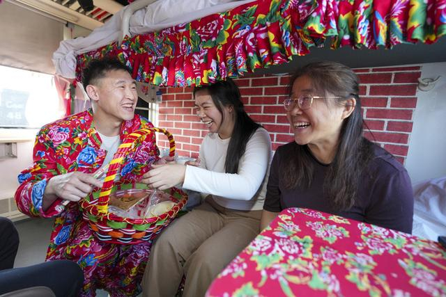 2月4日,在K7103次“列车大集”卧铺车厢内,身穿民俗服饰的乘务人员为旅客赠送煎饼。新华社记者 王松 摄2月4日,黑龙江2026年首趟“列车大集”K7103次由哈尔滨始发,开往加格达奇。本次“列车大集”车厢悬挂火红灯笼、玉米串、红辣椒等,配以冰雪主题装饰与马年新春对联,营造出浓郁热烈的新年氛围。列车上设置专属展区,涵盖黑龙江省特色农产品以及铁路文创、“非遗”手工艺品等,旅客可现场品尝体验、扫码下单,实现车上体验、快递到家的便捷购物方式。
